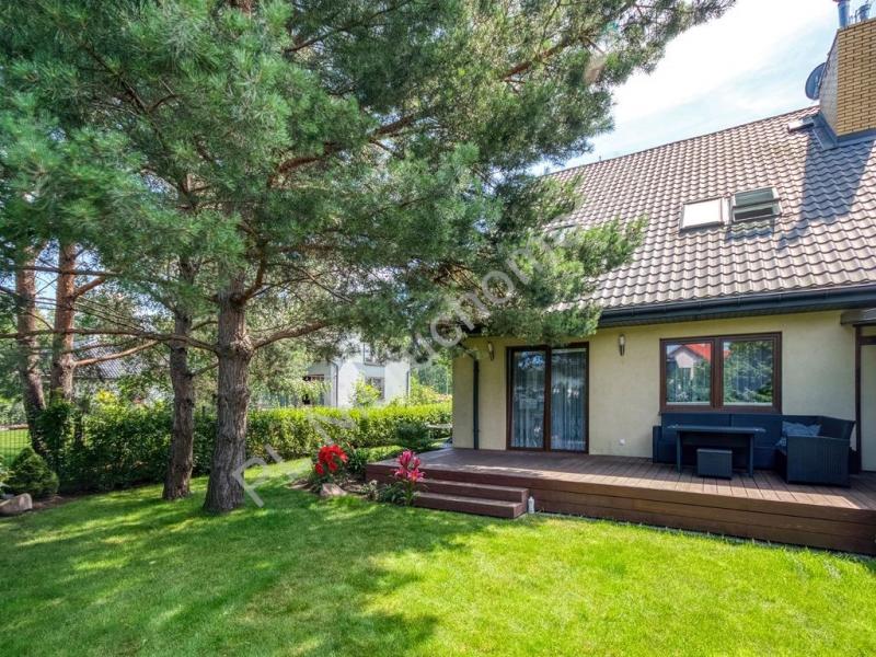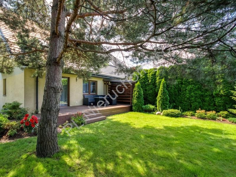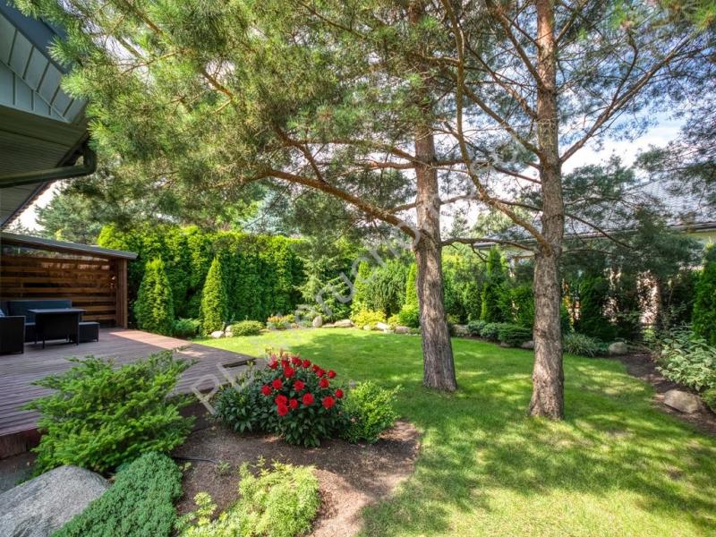 Ogród o powierzchni 460 m2 z pięknymi nasadzeniami, piękną sosną oraz rozprowadzonym nawodnieniem.