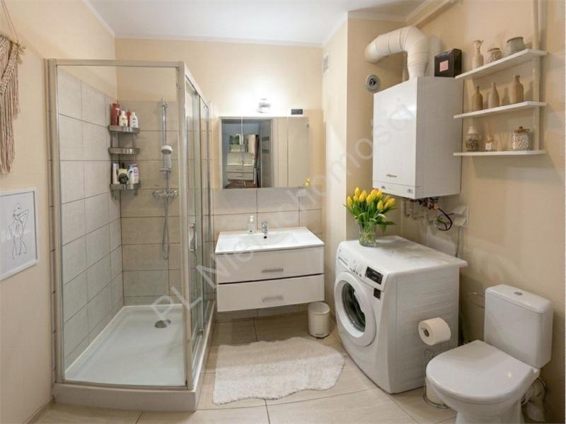 Łazienka 4 m. Wyposażona w duży prysznic (80 cm x 100 cm) w kształcie prostokąta, duża umywalka z dwoma szufladami, WC, pralkę oraz elektroniczny piec Viessmann.